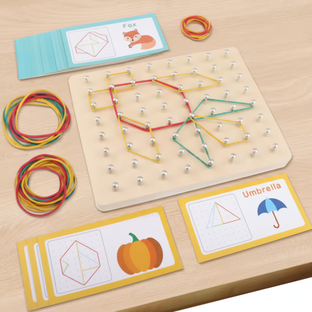 Met elke elastiek die om de houten pinnetjes wordt gespannen, ziet je kind zijn idee letterlijk vorm krijgen. Rechte lijnen, verrassende figuren of fantasierijke patronen — wat eerst in hun hoofd zat, ligt nu voor hen op tafel.