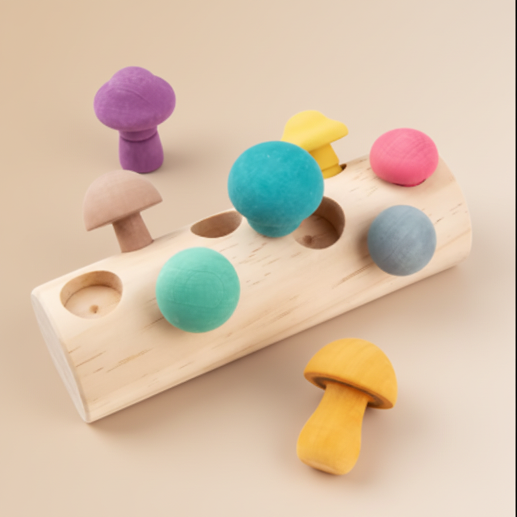 Het oppakken, plaatsen en rechtzetten van de houten paddenstoelen traint hand-oogcoördinatie en grijpkracht. Elke beweging voelt logisch, prettig en haalbaar voor kleine handjes.